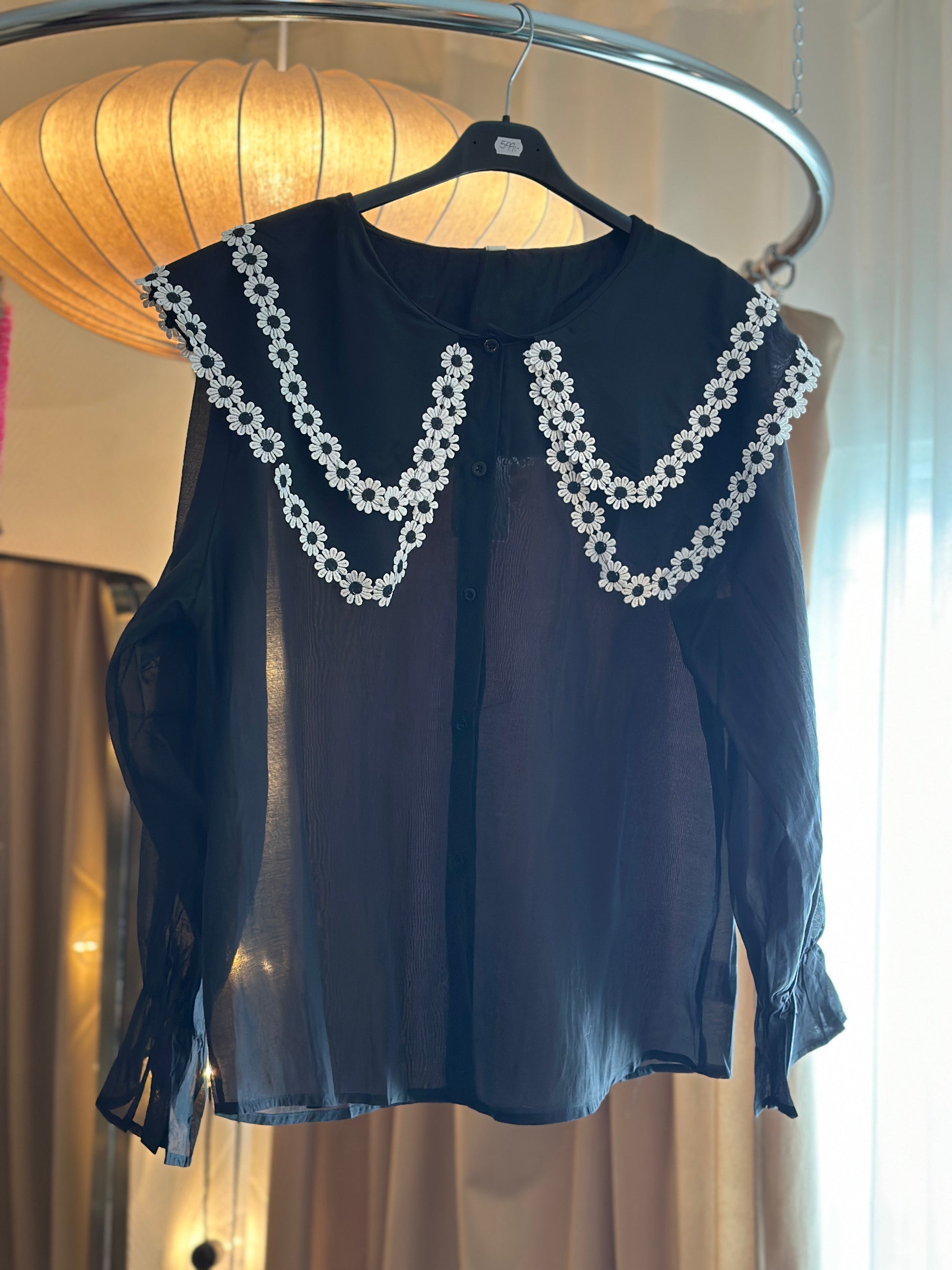 Blus ”Patricia” med stor krage med blommor på - Svart