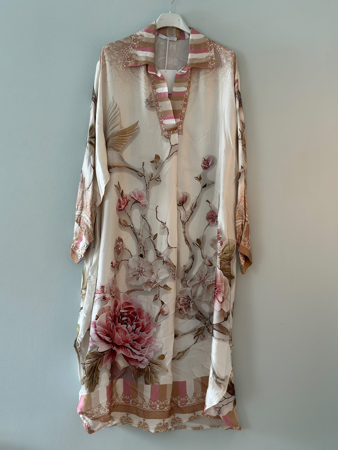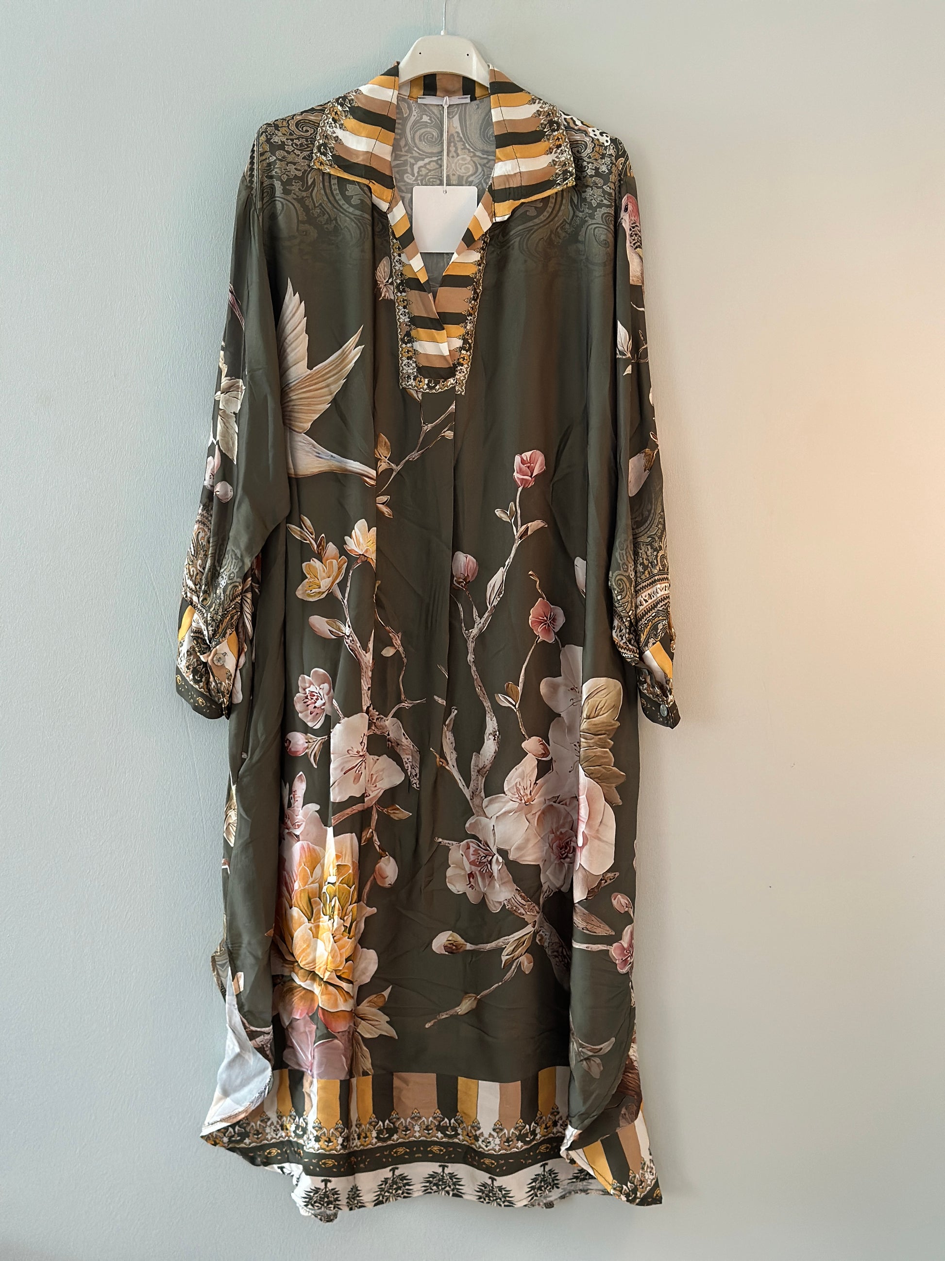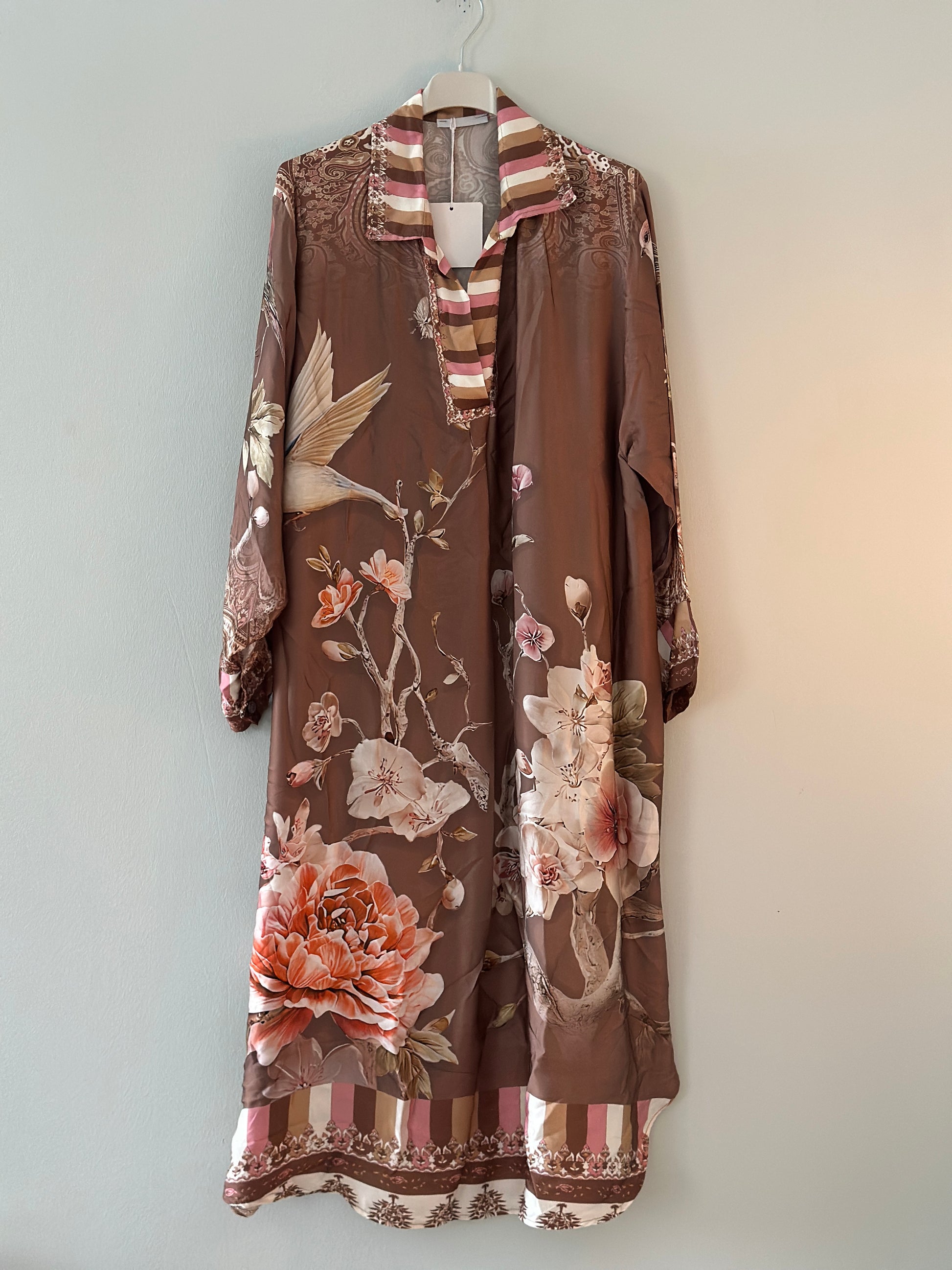 Klänning ”Malena” i vackert mönster - Vit/Brun/Grön