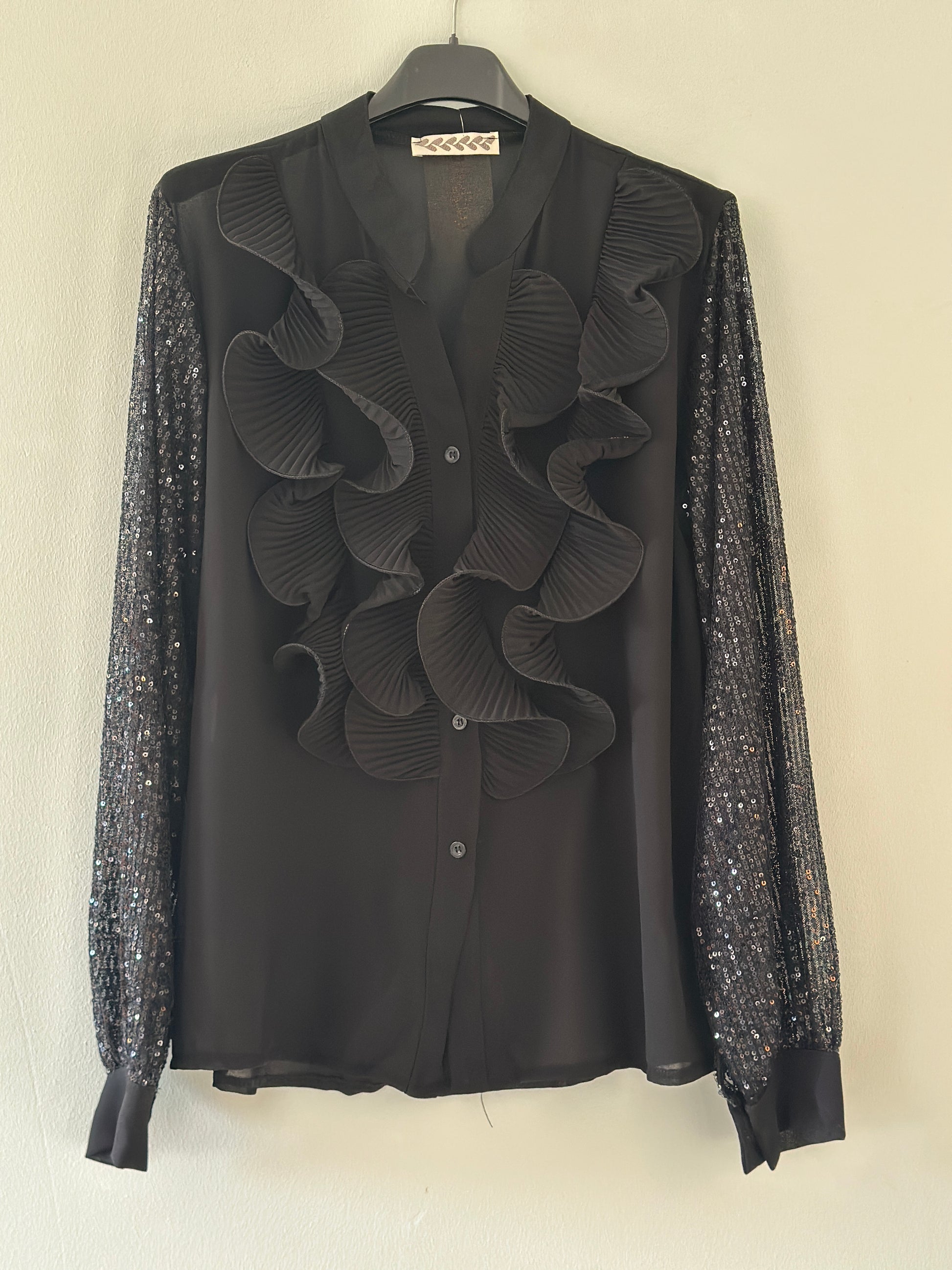 Kråsblus med paljettärmar - Svart/Brun/Burgundi