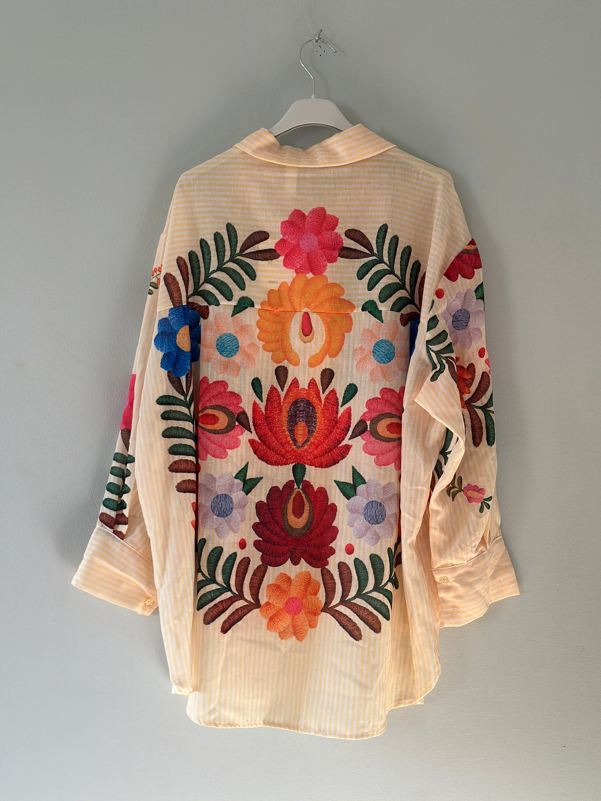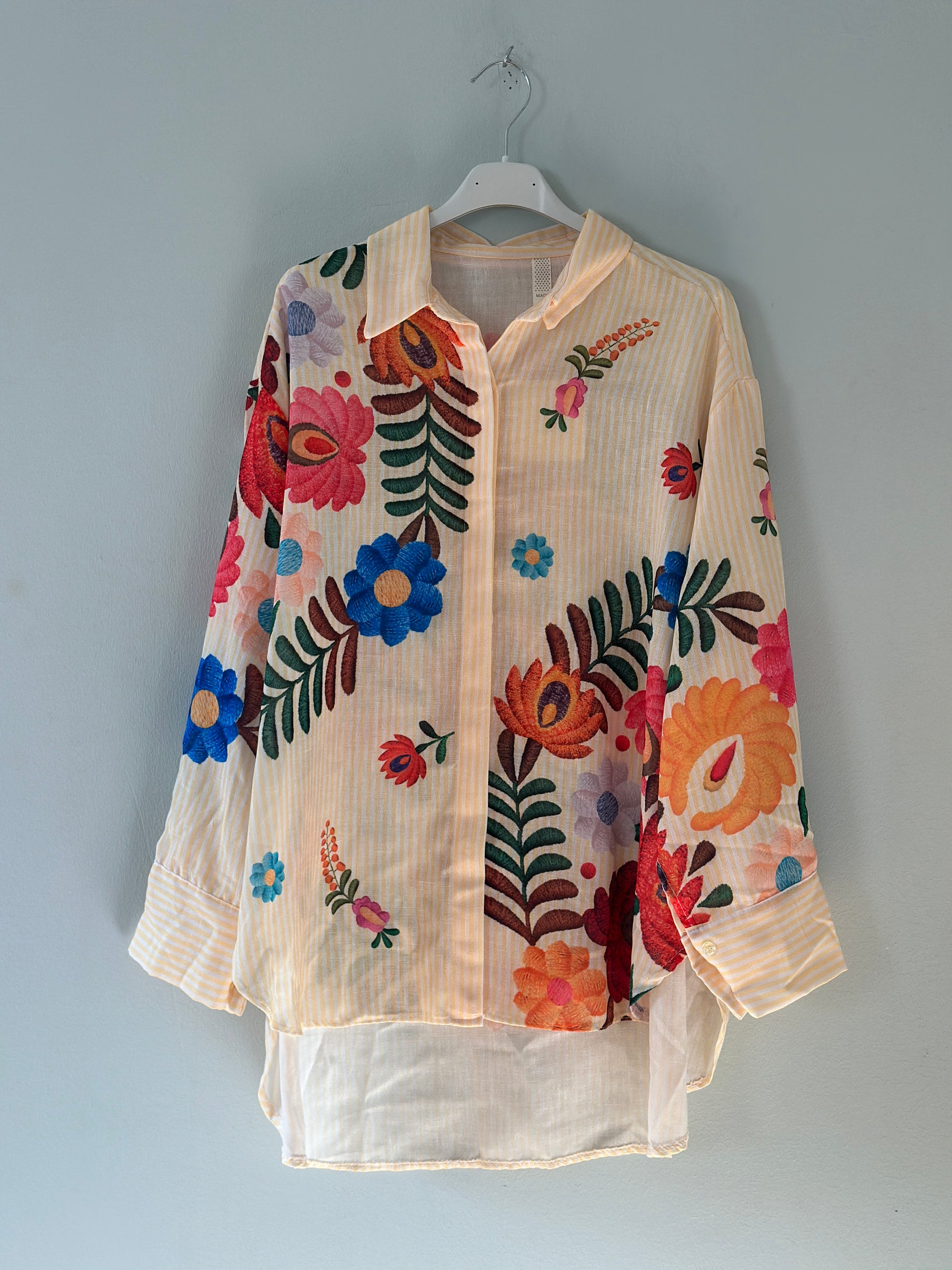 Randig blus ”Nora” med tryckt blommönster - Gul
