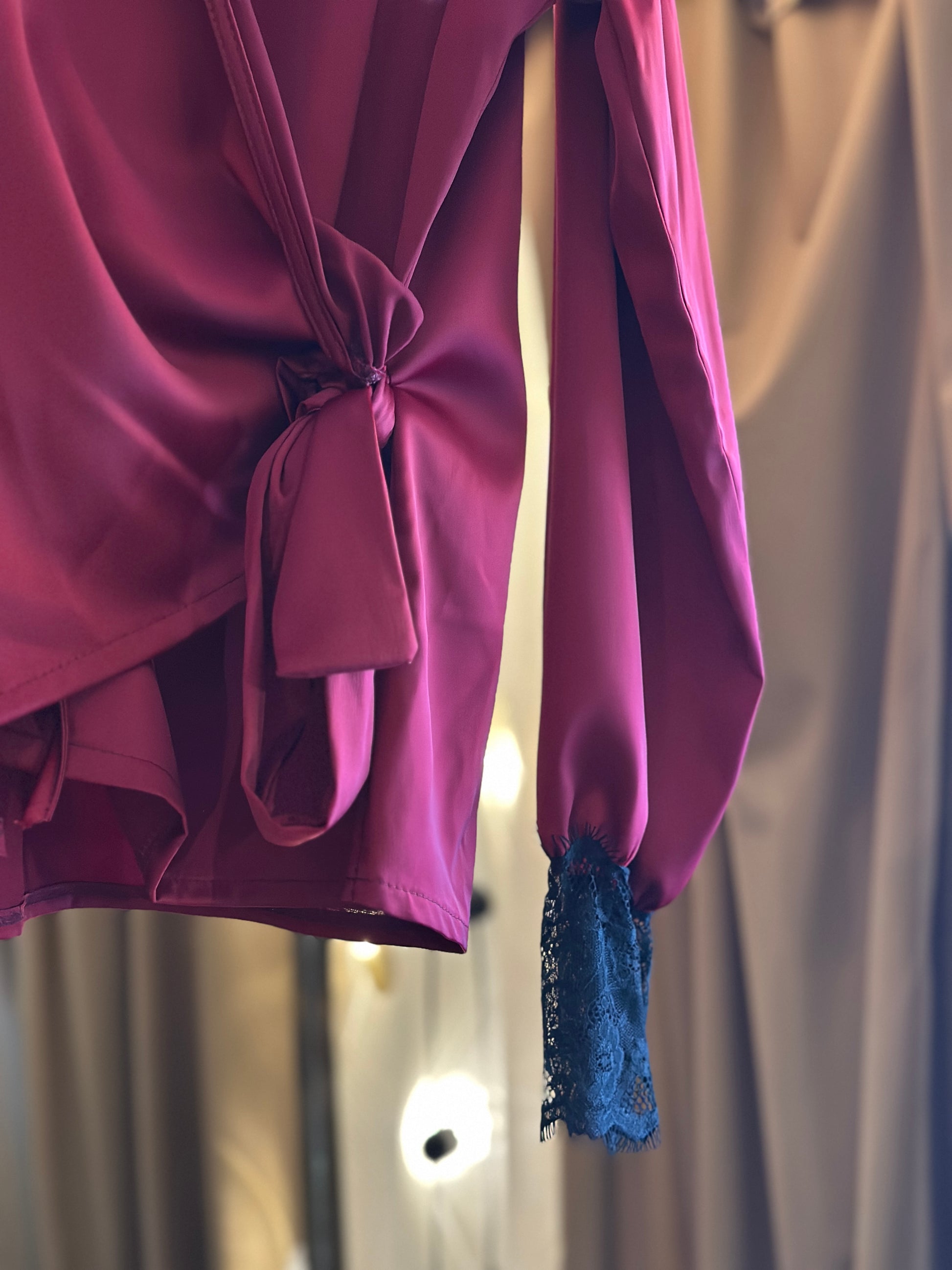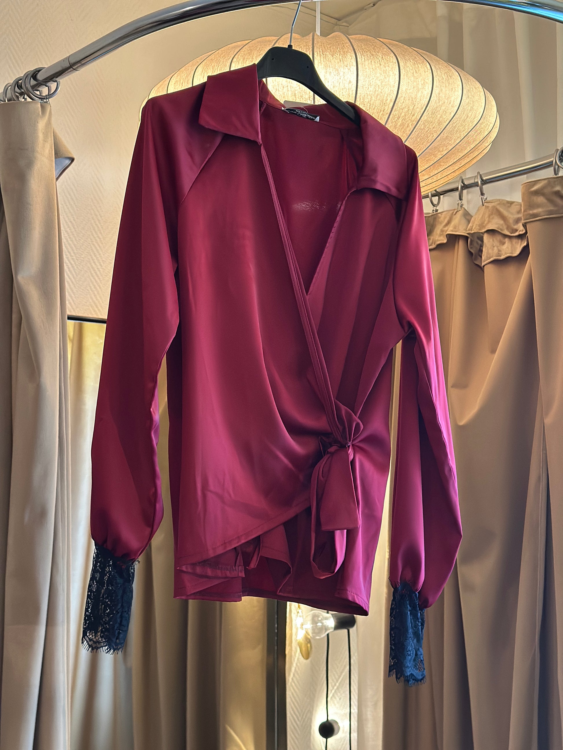 Röd Omlottblus med svart spets i ärmslutet - Röd