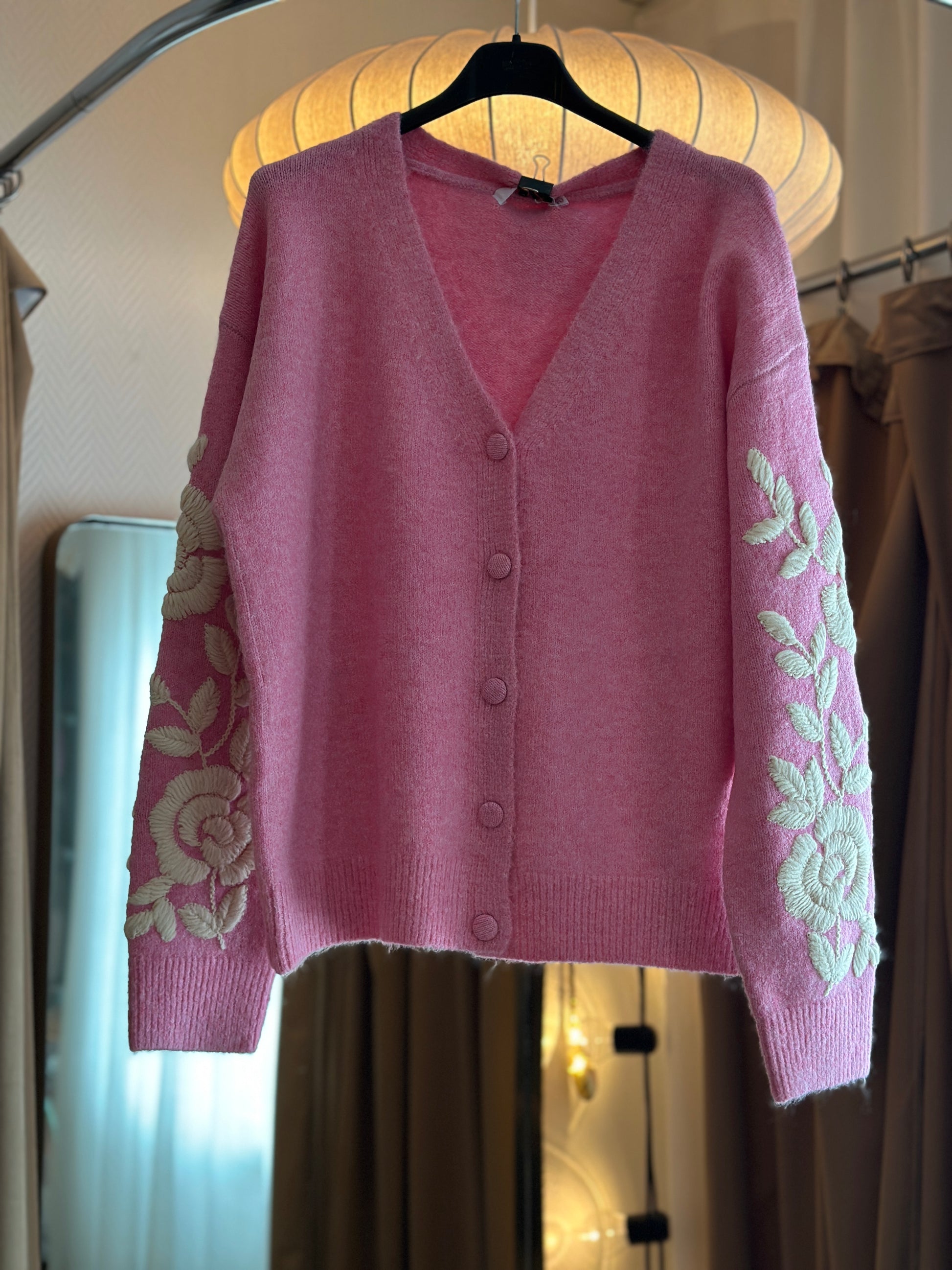 Stickad kofta ”Sofia” med klädda knappar och broderi på ärmarna -Korall/Rosa